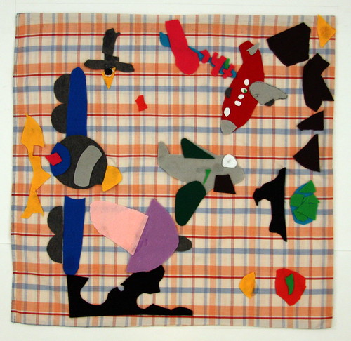 Materials and techniques: Donated fabric for panels, felt, fabric glue, fabric paint and acrylic paint.
