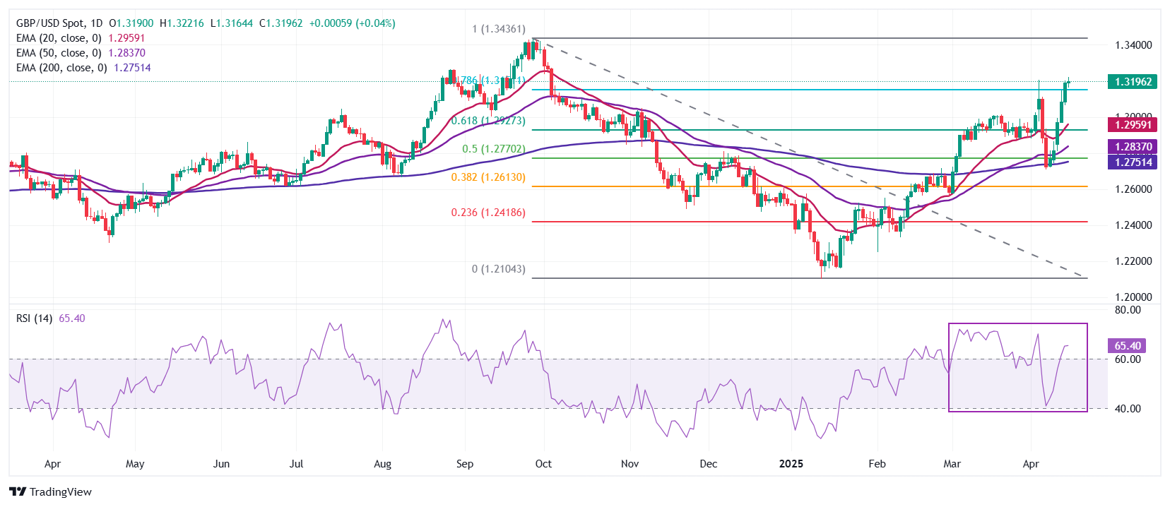The Pound Sterling extends its winning streak for the sixth trading day and jumps above 1.3200 against the US Dollar (USD) at the time of writing on Tuesday. The near-term outlook of the pair is upbeat as all short-to-long Exponential Moving Averages (EMAs) are sloping higher below the current price.