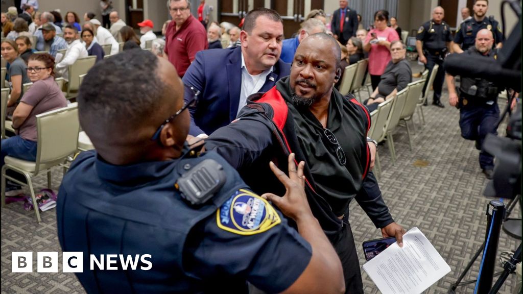 A town hall hosted by Republican Rep Marjorie Taylor Greene in Cobb County, Georgia, was repeatedly disrupted by protesters on Tuesday evening. Footage shows police removing three people within minutes of Greene taking the stage, with officers tasering one man inside the venue. About six people were removed from the event, with three arrested, Acworth Police told CBS News. Officers confirmed a taser had been used on a second attendee. Two arrestees face charges of simple battery on a law enforcement officer and obstructing a law enforcement officer. A third is charged with vulgar language. Greene told reporters she was “very thankful” for how police had handled the incident, saying she was “glad they got thrown out”. In a statement the police department said its officers had been “threatened, physically resisted, and harmed” while removing protesters.