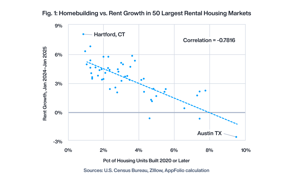 Table 1 suggests an inverse relationship between homebuilding and rent growth. Apartment owners in Austin, where construction has surged, are seeing rents slump, while rents are spiking in Hartford where construction has stalled. Figure 1 confirms that this tendency is not limited to these two cities.