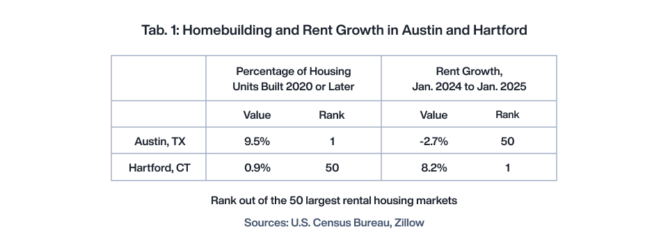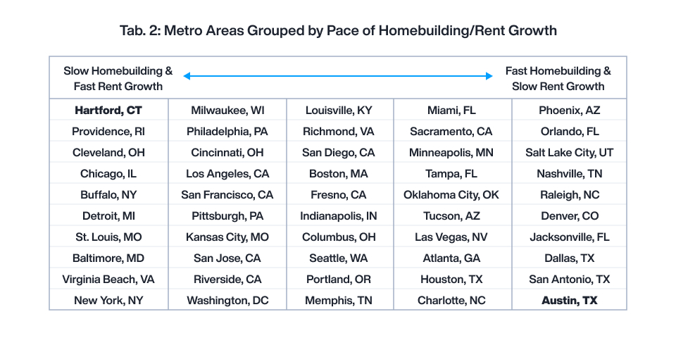 The points in Figure 1 reveal a clear, inverse relationship between homebuilding and rent growth. Like Austin, several other cities with high rates of residential construction are seeing slow rent growth. The last column of Table 2 lists these cities. Meanwhile, in Hartford and the other cities in the first column, homebuilding has been tepid, and rents are surging.