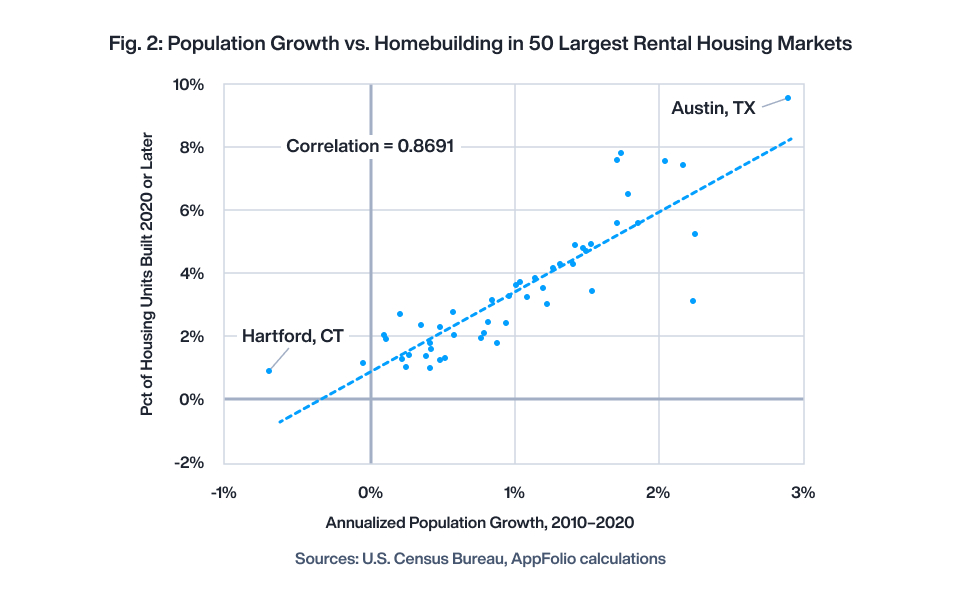 Figure 2 confirms this expectation. Previously, we learned that among major rental markets, Hartford is experiencing the nation’s slowest rate of homebuilding; in Figure 2, we find that this metro area also had the group’s slowest rate of population growth between 2010 and 2020. By contrast, Austin claimed last decade’s fastest pace of population growth, and it boasts the highest rate of recent homebuilding. The positive correlation extends beyond these bookends. Expanding the analysis to the 50 largest markets, we see that the nationwide correlation between population growth and homebuilding is very robust at 0.87.