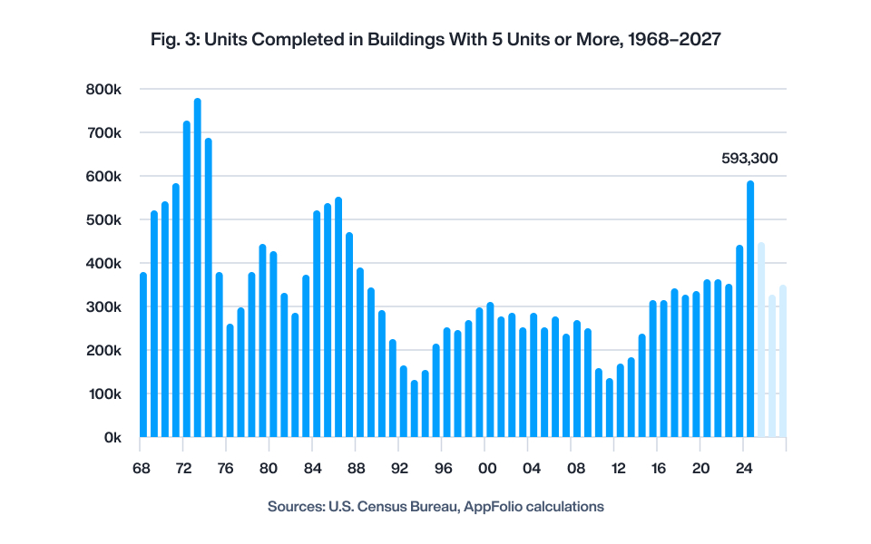 However, surplus supply will not fall in line with population growth if apartment construction does not retreat from its near-record pace. According to the Census Bureau, nearly 600,000 multifamily units were completed in 2024, the most in 50 years (Figure 3).