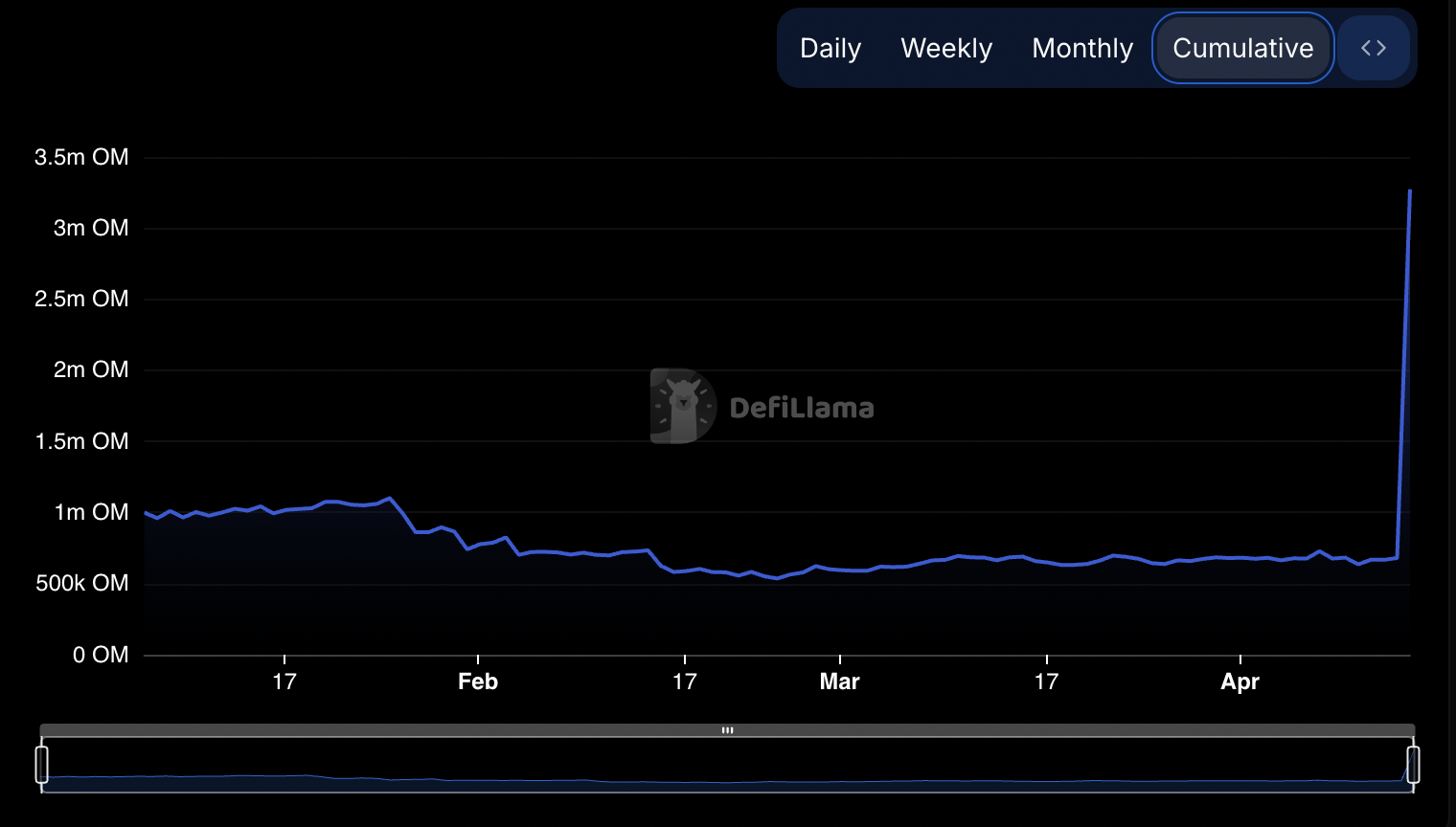As of April 15, Mantra’s TVL (in OM terms) jumped to 4.21 million OM (~$3.24 million), an increase of over 500% from two days prior, according to data resource DefiLlama.