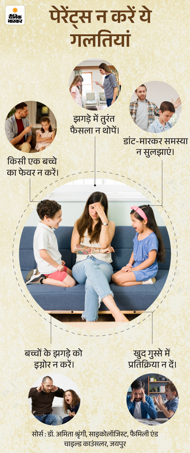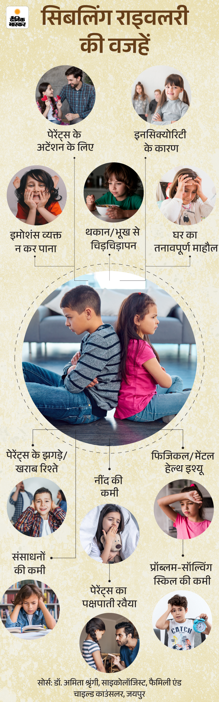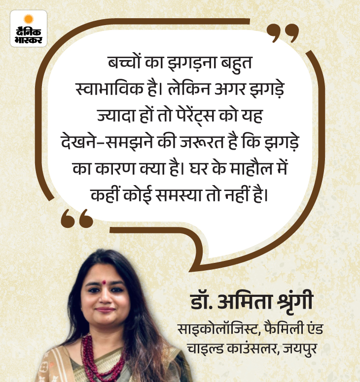 जवाब- मैं आपकी चिंता को समझ सकती हूं। सिबलिंग्स के बीच झगड़े अक्सर पेरेंट्स के लिए भावनात्मक रूप से थका देने वाला अनुभव होता है। लेकिन सबसे पहले ये समझिए कि सिबलिंग राइवलरी यानी भाई-बहनों के बीच कंपटीशन और झगड़ा बचपन का हिस्सा है।
