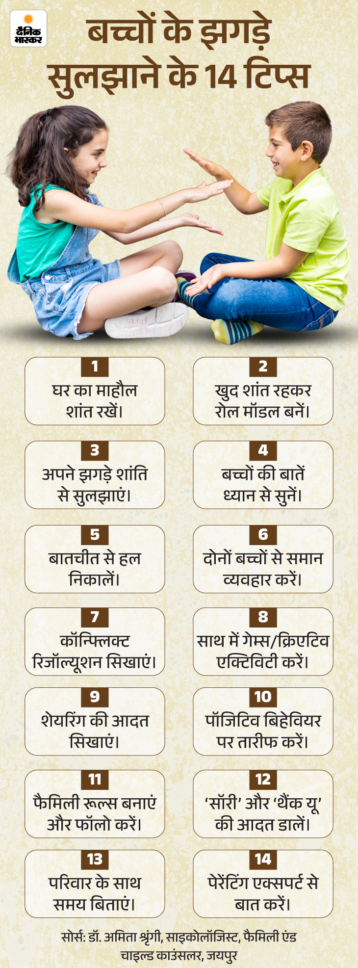 अक्सर माता-पिता गुस्से में आकर बच्चों को डांटते या सजा देते हैं। इससे अस्थायी शांति तो आती है, लेकिन यह समस्या का समाधान नहीं होता है। डर या दबाव से बच्चे झगड़ा बंद कर देते हैं, लेकिन उनसे यह नहीं सीख पाते कि मतभेद को कैसे सुलझाना है। इसलिए जरूरी है कि आप उन्हें सहयोग, बातचीत और टीमवर्क की दिशा में गाइड करें। इसके लिए कुछ बातों का खास ख्याल रखें।