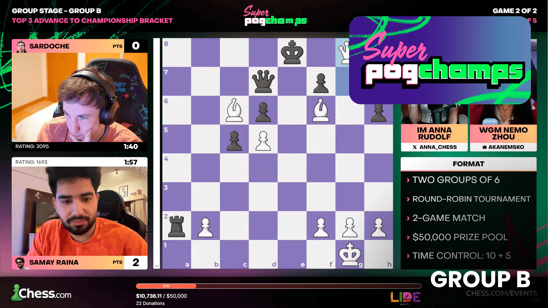 In game two, Samay finally faltered, blundering a full piece and, for the first time in the day, getting himself into a terrible position. But despite being Super, this is still PogChamps. Tyler found a brilliant knight sacrifice that turned out to be a game-losing mistake, throwing game two and the match.Â