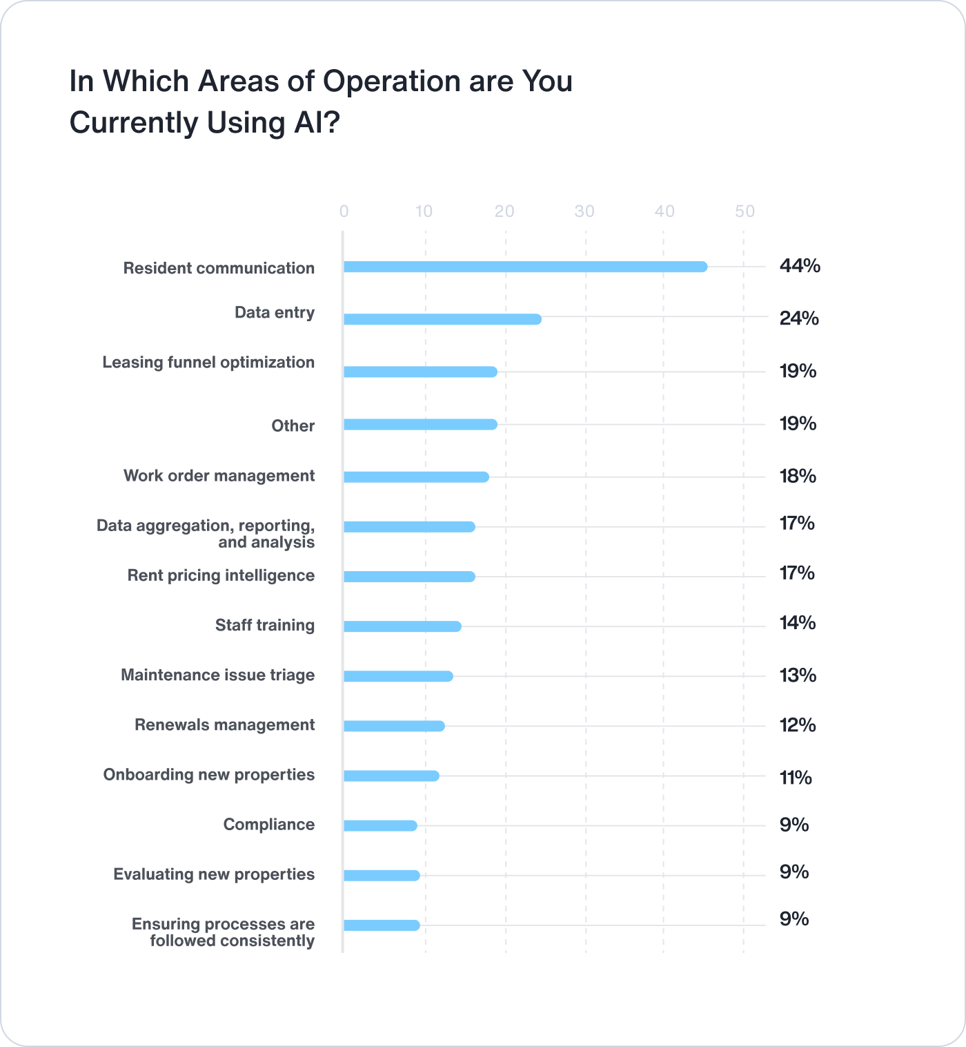 Investing in the right AI use cases can yield major efficiency gains while also benefiting both the wider property management team and residents. For example, resident communication is a natural fit for AI optimization. Forty-four percent of property managers that are currently using AI are using it for resident communication. Generative AI tools can enable more efficient and consistent resident communication about a variety of subjects, including maintenance issues and payment reminders. Improved resident communication can help boost renter satisfaction and build loyalty while creating more efficient workflows for managers.