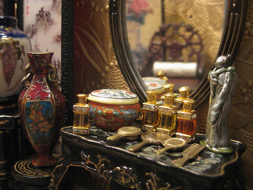Tagged: , miniature , 1:12 , 1:12 scale , dollhouse miniature , dollhouse , toy , antique , artisan , Chinese , Japanese , dressing room , mirror , reflection , looking glass , perfume bottle , bottle , dressing table set , hairbrush , hairbrushes , comb , brush , brushes , jar , Famille Rose , Cantonese Famille Rose , powder bowl , lidded bowl , vase , vases , Satsuma , Satsuma ware , Satsuma export ware , made in Japan , dollhouse furniture , Satsuma vase , cloisonné , cloisonne , cloisonné vase , cloisonne vase , oxblood , oxblood vase , oxblood cloisonné vase , oxblood cloisonne vase , red oxblood , chinoiserie , chinoiserie table , chinoiserie furniture , Bespaq , Bespaq furniture , made in China , chair , table , Chinese chair , Dragon chair , screen , Chinese screen , figure , figurine , gold paper , wallpaper , embossed paper , stand , bolster , tabletop , tabletop photography , miniature room , diorama , tableau