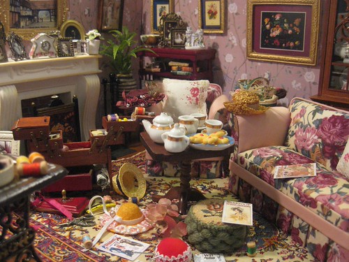 Tagged: , hat , straw hat , tea set , teapot , cup , sugar bowl , biscuits , pink , green , floral pattern , chintz , ribbon , flower , flowers , tape measure , rose , thread , spool , scissors , table , spool of thread , reel of cotton , sewing box , chair , sofa , millinery , display , hat display , accessory , accessories , sewing machine , seat , millinery display , pincushion , accessories display , fireplace , photo , photograph , photo frame , clock , magazine , Weldon , Ken Blythe , Ken Blythe miniature , drawing room , sewing , picture , painting , frame , photograph frame , picture frame , fashions , handmade , handmade dollhouse miniature , 1:12 , 1:12 scale , dollhouse miniature , dollhouse , toy , antique , artisan , Edwardian , interior , tabletop , tabletop photography , miniature room , diorama , tableaux , macro , macro photography , footstool