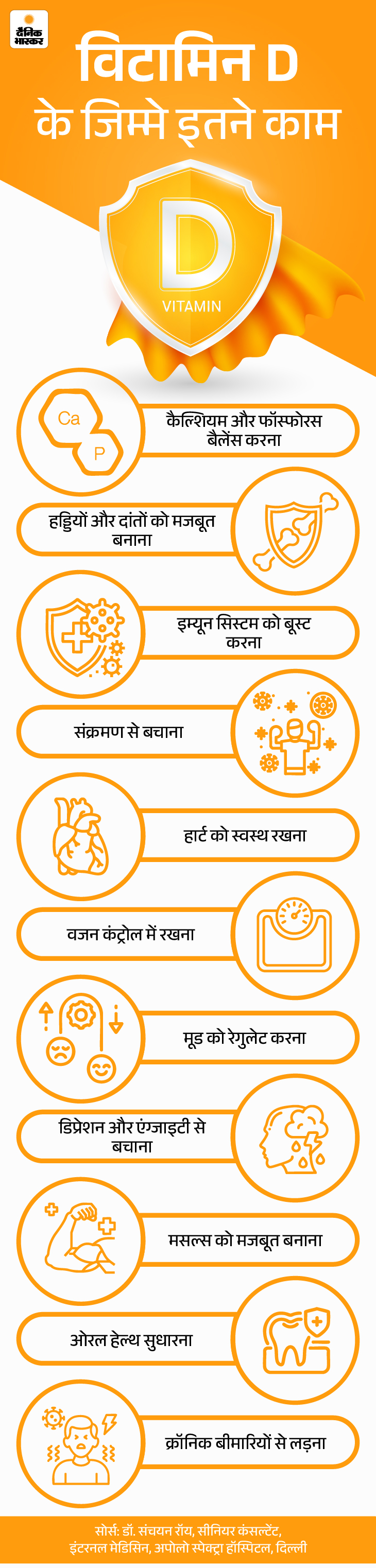 जवाब- विटामिन D हमारे शरीर का एक साइलेंट हीरो है। यह न सिर्फ हड्डियों को मजबूत रखता है, बल्कि पूरे शरीर को स्वस्थ बनाए रखने में मदद करता है।