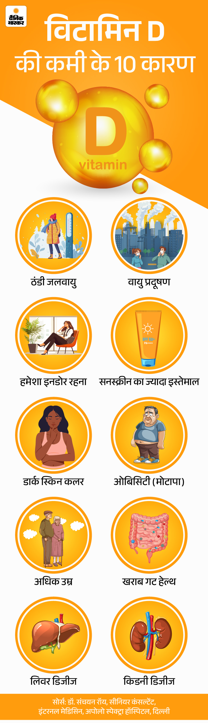 जवाब- डॉ. संचयन रॉय कहते हैं कि सर्दियों में लोग धूप से दूर रहते हैं, जो विटामिन D की कमी का मुख्य कारण है। प्रदूषण और जीवनशैली भी इसमें रोल निभाते हैं।