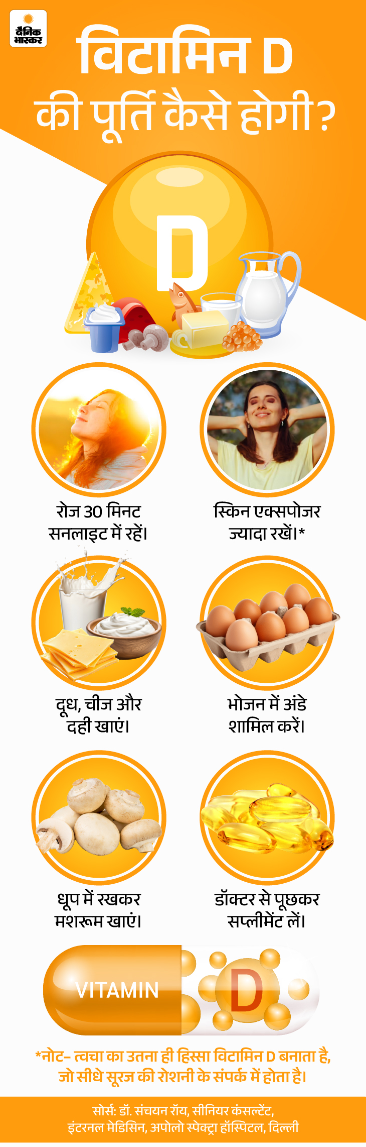 जवाब- इंडियन जर्नल ऑफ एंडोक्रोनोलॉजी की स्टडी के मुताबिक, भारतीयों को विटामिन D मेन्टेन करने के लिए रोज लगभग आधे घंटे धूप में रहना चाहिए। सर्दियों में 10 AM से 3 PM के बीच धूप लेना बेहतर है। इसे पूरा करने के लिए सभी उपाय ग्राफिक में देखिए-