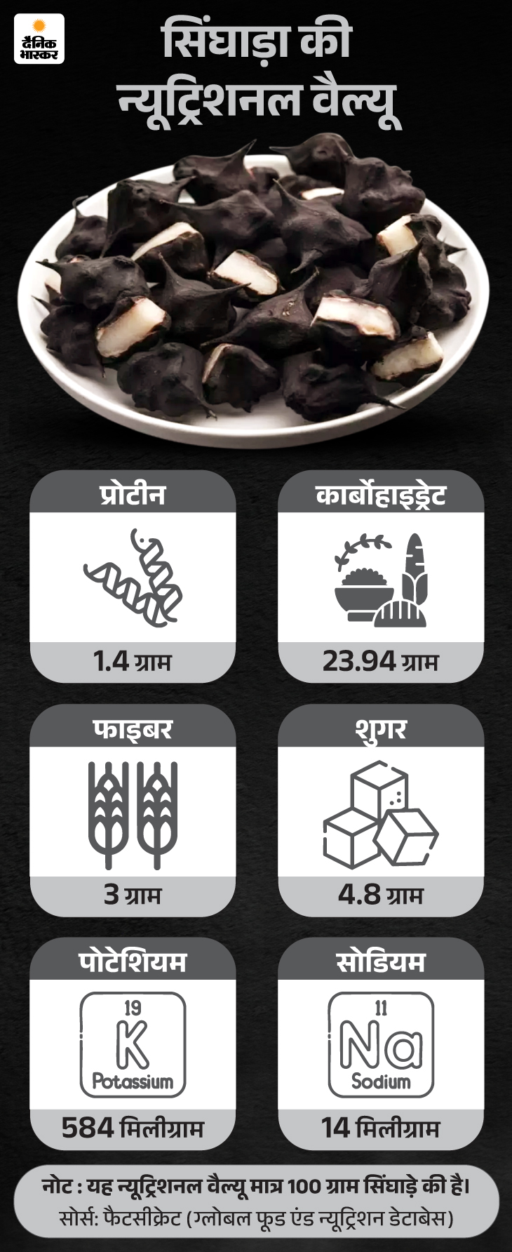 जवाब- सीनियर डाइटीशियन डॉ. पूनम तिवारी बताती हैं कि एक स्वस्थ व्यक्ति के लिए 8-10 (कच्चे या उबले हुए) सिंघाड़े प्रतिदिन खाना पर्याप्त है। व्रत के दौरान सिंघाड़े के आटे से बना खाना भी ठीक है, लेकिन 2 चपाती या 1 कटोरी हलवा से ज्यादा नहीं।
