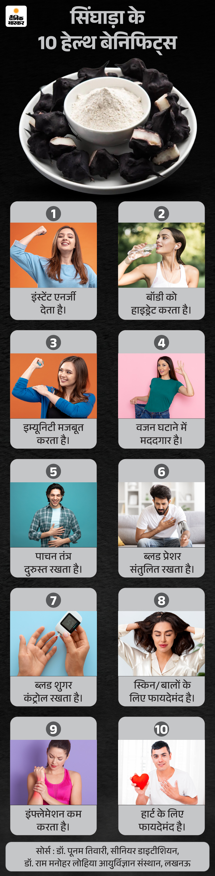 इंटरनेशनल जर्नल ऑफ प्लांट एंड सॉइल साइंस (IJPSS) में पब्लिश एक स्टडी के मुताबिक, सिंघाड़ा अपने रिच न्यूट्रिशन और फाइटोकेमिकल प्रोफाइल की वजह से कई तरह के हेल्थ बेनिफिट्स देता है। नीचे दिए ग्राफिक से इसे समझिए-