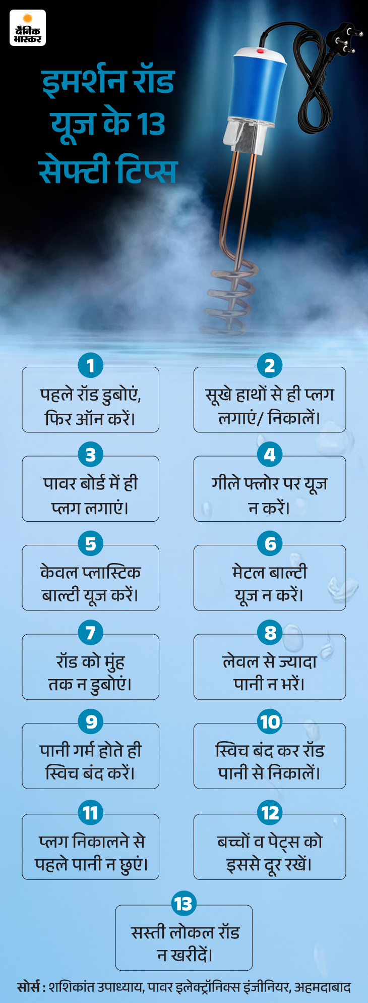 जवाब- इमर्शन रॉड के इस्तेमाल के दौरान कुछ छोटी-छोटी सावधानियां बरतकर हादसों से बचा जा सकता है। इसे नीचे दिए ग्राफिक से समझिए-