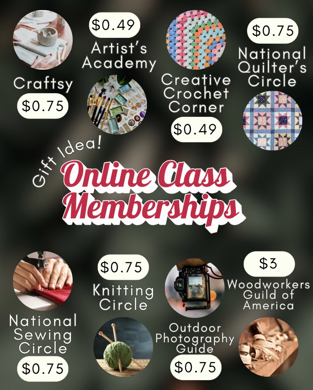 Looking for a unique gift idea? These Online Class Memberships are perfect for anyone on your list and would make a perfect gift. Plus, they are all under $3!