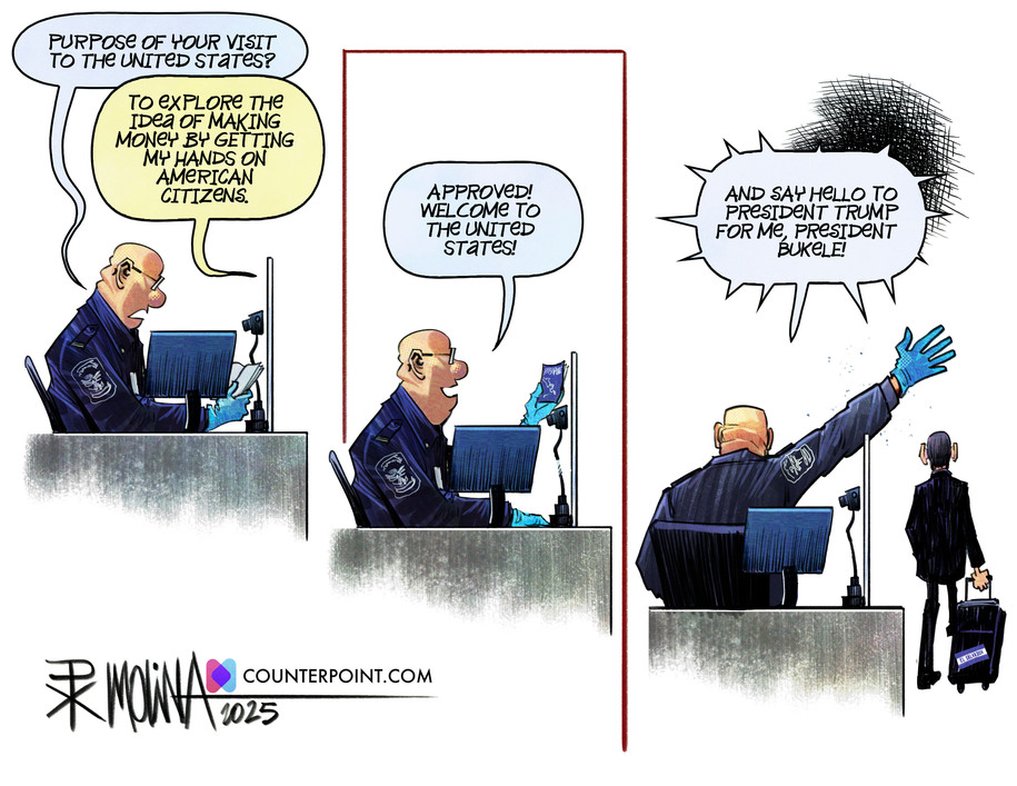 Home » Cartoon » Cartoon: Welcome to the United States! CartoonCecotDeportationsDonaldTrumpElSalvadorICEImmigrationMAGANayibBukelePedroMolinaProject2025UnitedStates Cartoon: Welcome to the United States! admin April 18, 2025 0 Views 0 SaveSavedRemoved 0 A cartoon by Pedro Molina. Related | Trump is chomping at the bit to send US citizens to Salvadoran prison Campaign Action