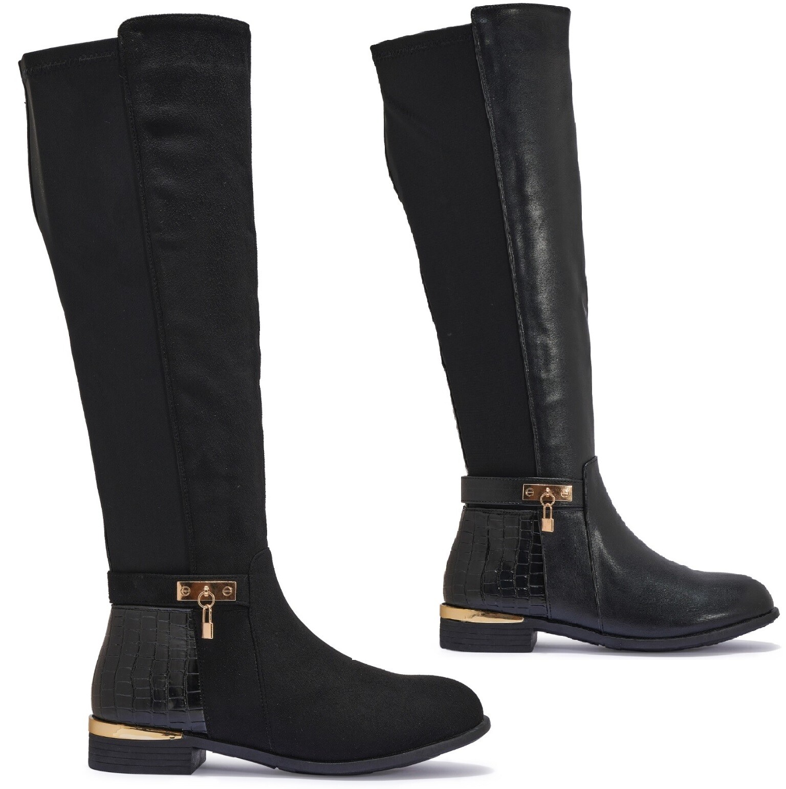 LADIES WOMENS FASHION BUCKLE KNEE HIGH STRETCH CALF LEG ZIP FLAT HEEL BOOTS SIZE