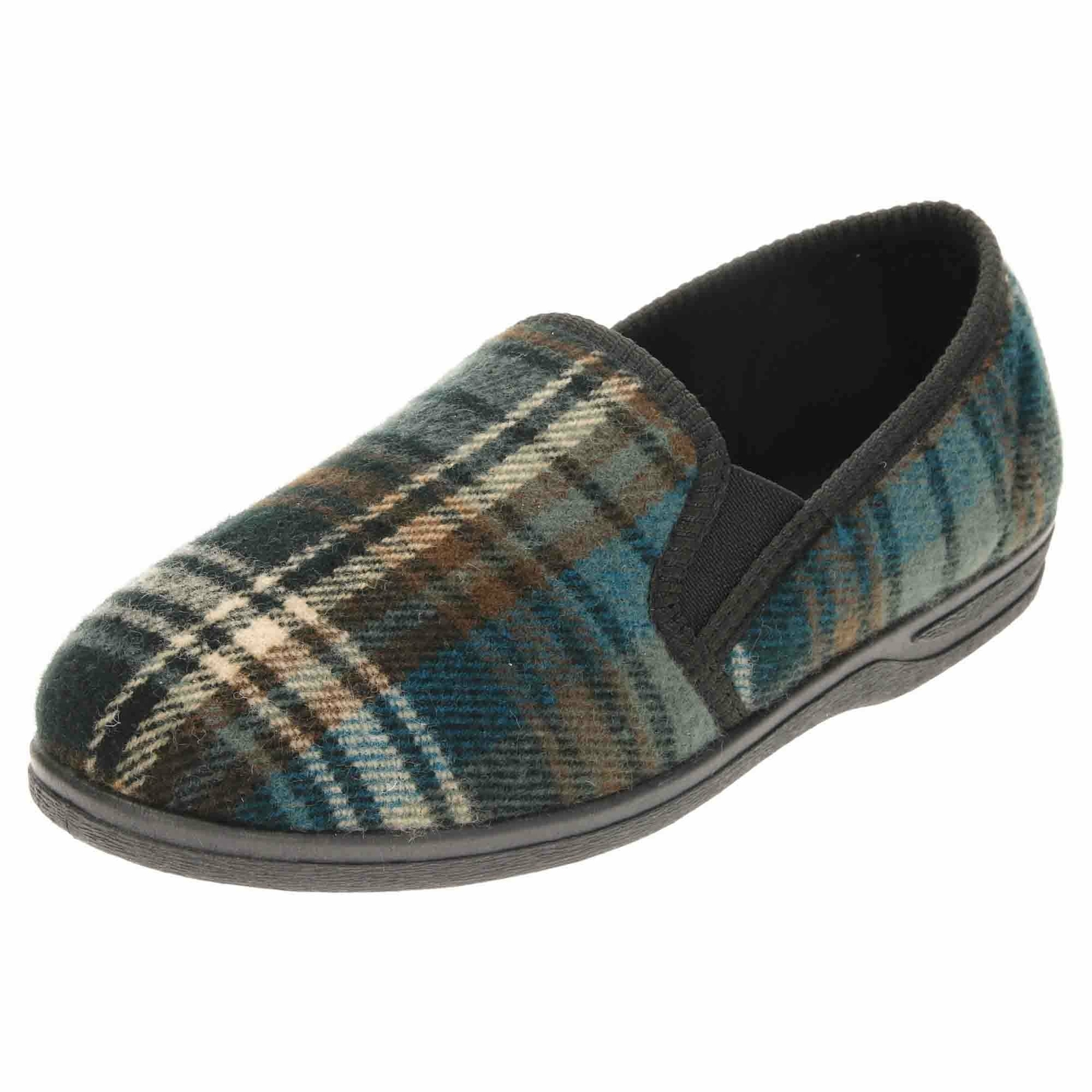 Mens Slippers Navy House Shoe Twin Gusset Check Multi Slip On Full Moccasin Pump