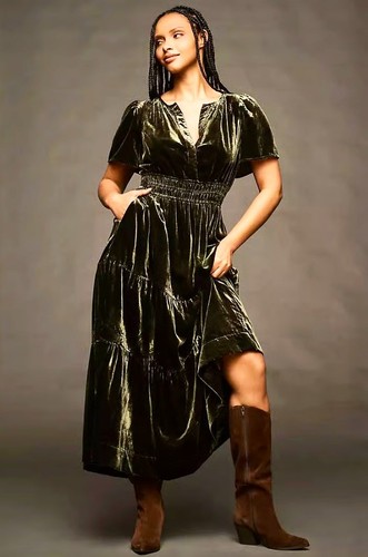 Anthropologie The Somerset Maxi Dress Velvet Tiered Smoked Moss Green XL NEW