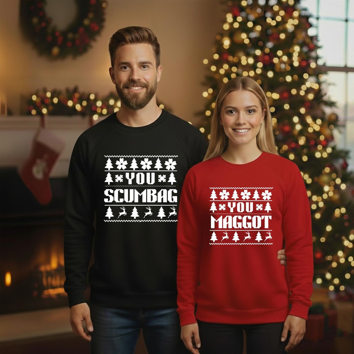 Couple’s Funny Christmas Matching Sweatshirt Top – You Scumbag & You Maggot