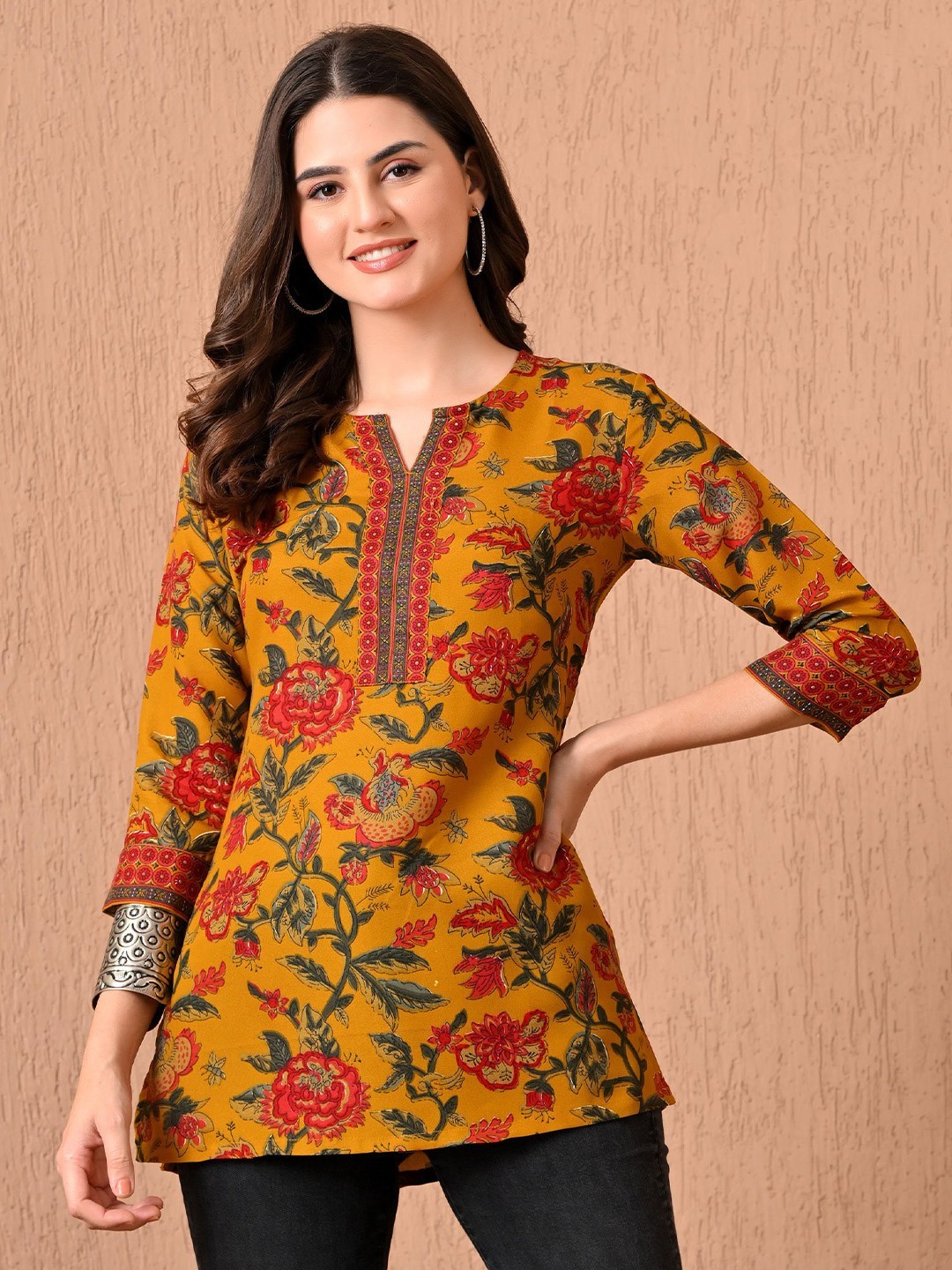 Indian Women Mustard Yellow Cotton Floral Printed Top Tunic Kurta Kurti Dress