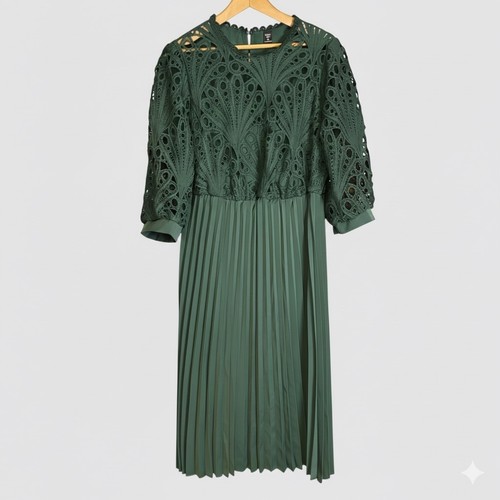 Shein Curve 1XL Emerald Green Lace Overlay Pleated Midi Dress Belted NWOT