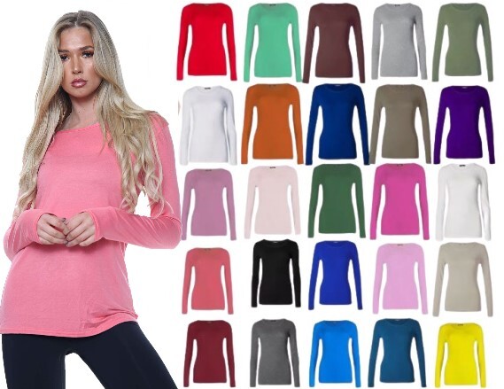 Women Ladies Plain Long Sleeve T-Shirts Stretchy Casual Slim fit Round Neck Tops