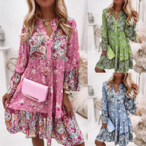 Womens Floral Boho Midi Dress Kaftan Ladies Ruffle Summer Beach Swing Sundress