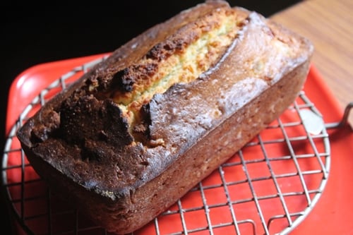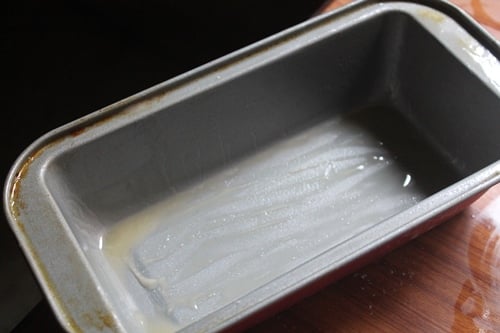 Spoon this into baking pan and bake for 1 hour. Remove and let it cool down for 10 mins in pan. Remove to a cooling rack and cool it for 15 mins.