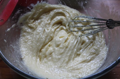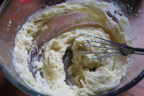 Now in a larger bowl, take butter, sugar, vanilla, orange zest and whip till creamy. Add in egg one at a time and whip well. Now add in the flour mix, yogurt and milk and fold gently.