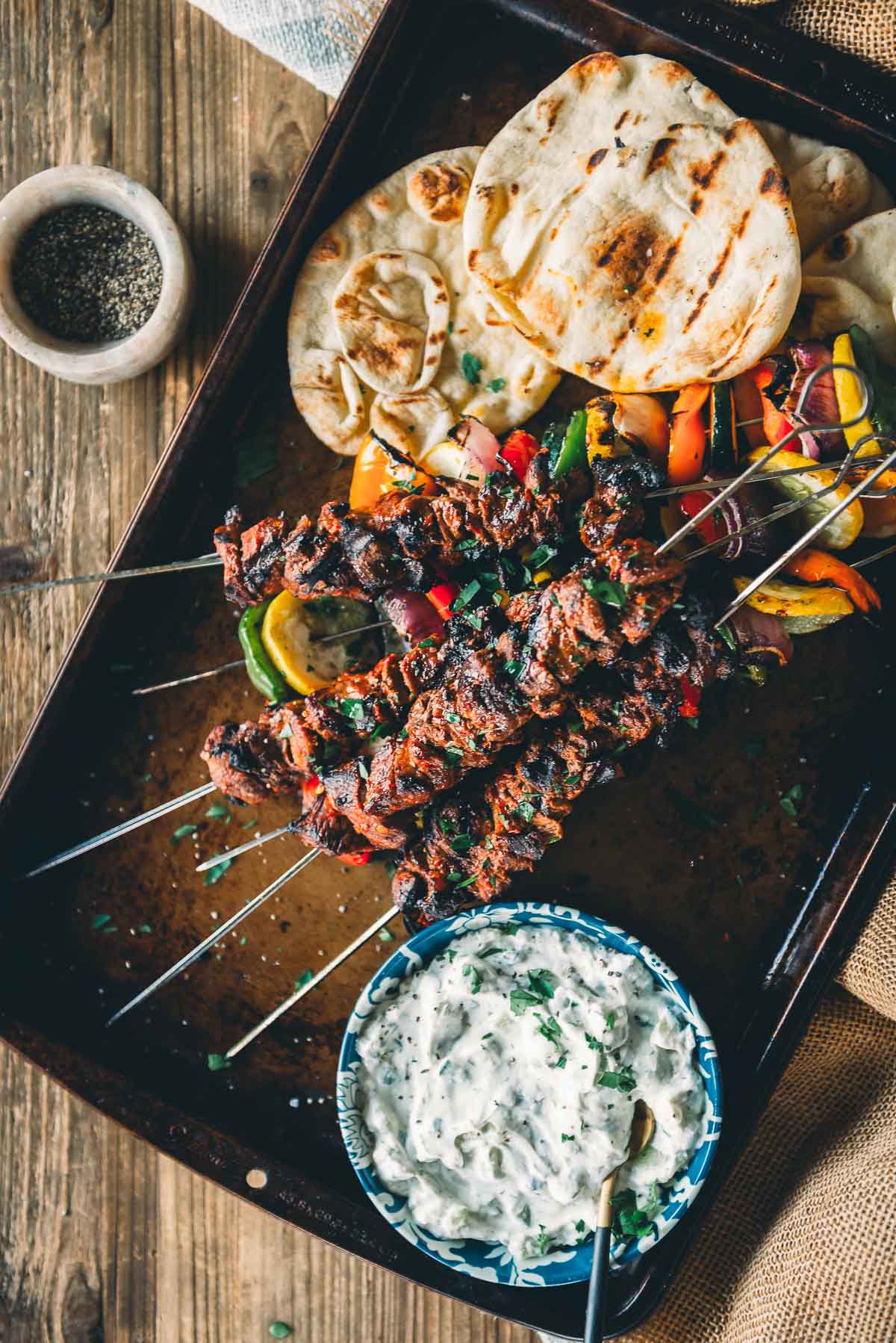 - Grill the skewers over direct heat, rotating every few minutes, until the lamb reaches 130°F for medium-rare and the veggies are slightly charred and tender.