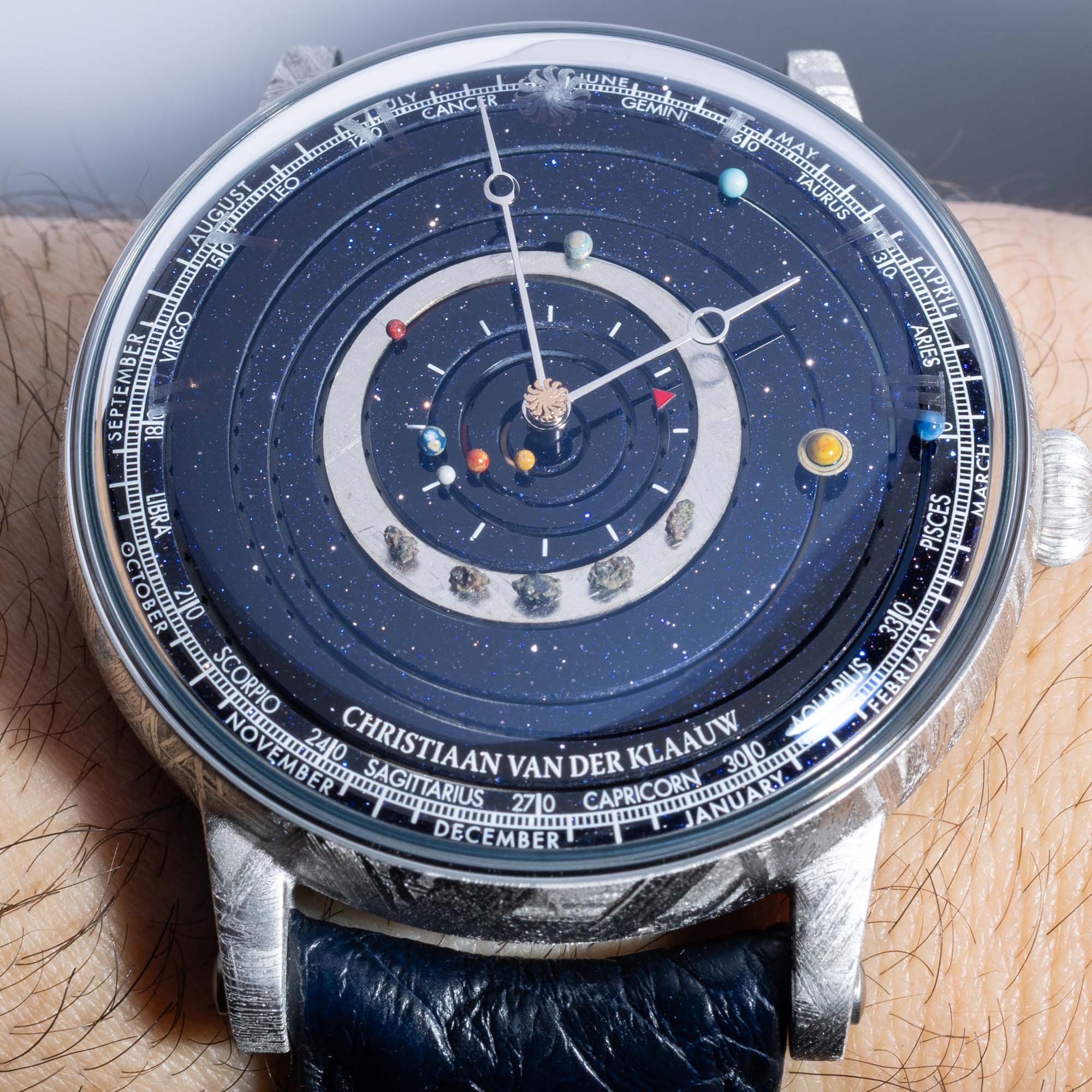 In the very center of the watch is the sun, which spins and is also the seconds indicator. The outer periphery of the dial is a calendar indicator that moves along a month and zodiac track. Since the planetary motions are aligned, adjusting the Christiaan van der Klaauw Grand Planetarium Eccentric is easy and is entirely done through the crown. The backdrop of this marvelous celestial display is polished blue aventurine, which attractively resembles a starry view of the night sky. As I mentioned above, each of the small planets on the dial is actually hand-painted with remarkable detail. The Meteorite limited edition version of the Christiaan van der Klaauw Grand Planetarium Eccentic has a slightly different cosmetic feature on the dial: There is a meteorite metal ring in the middle of the dial that has a few actual space rocks attached to it. This isn’t just decorative but is intended to represent the main asteroid belt that exists in the middle of our solar system. That’s pretty cool.