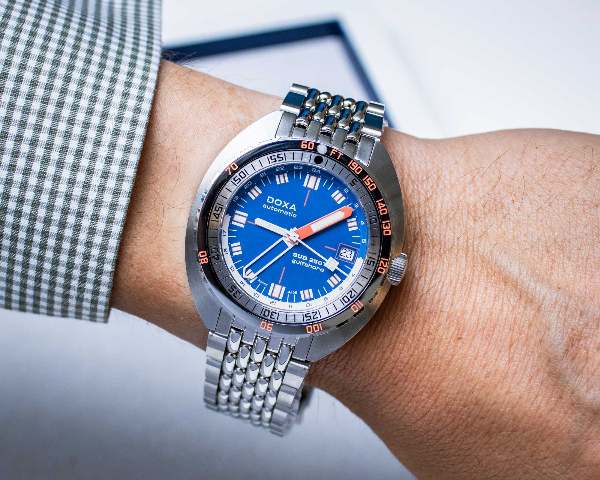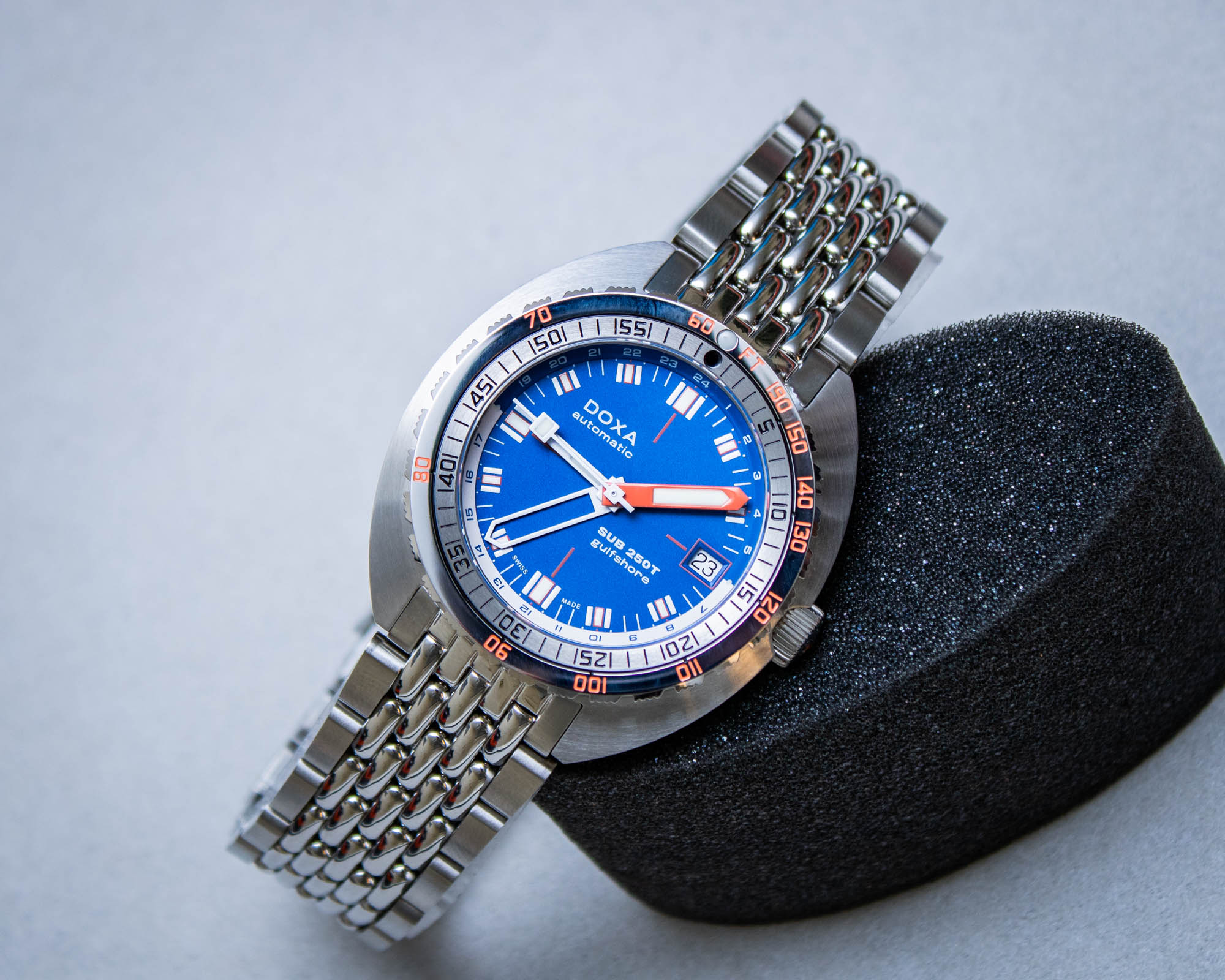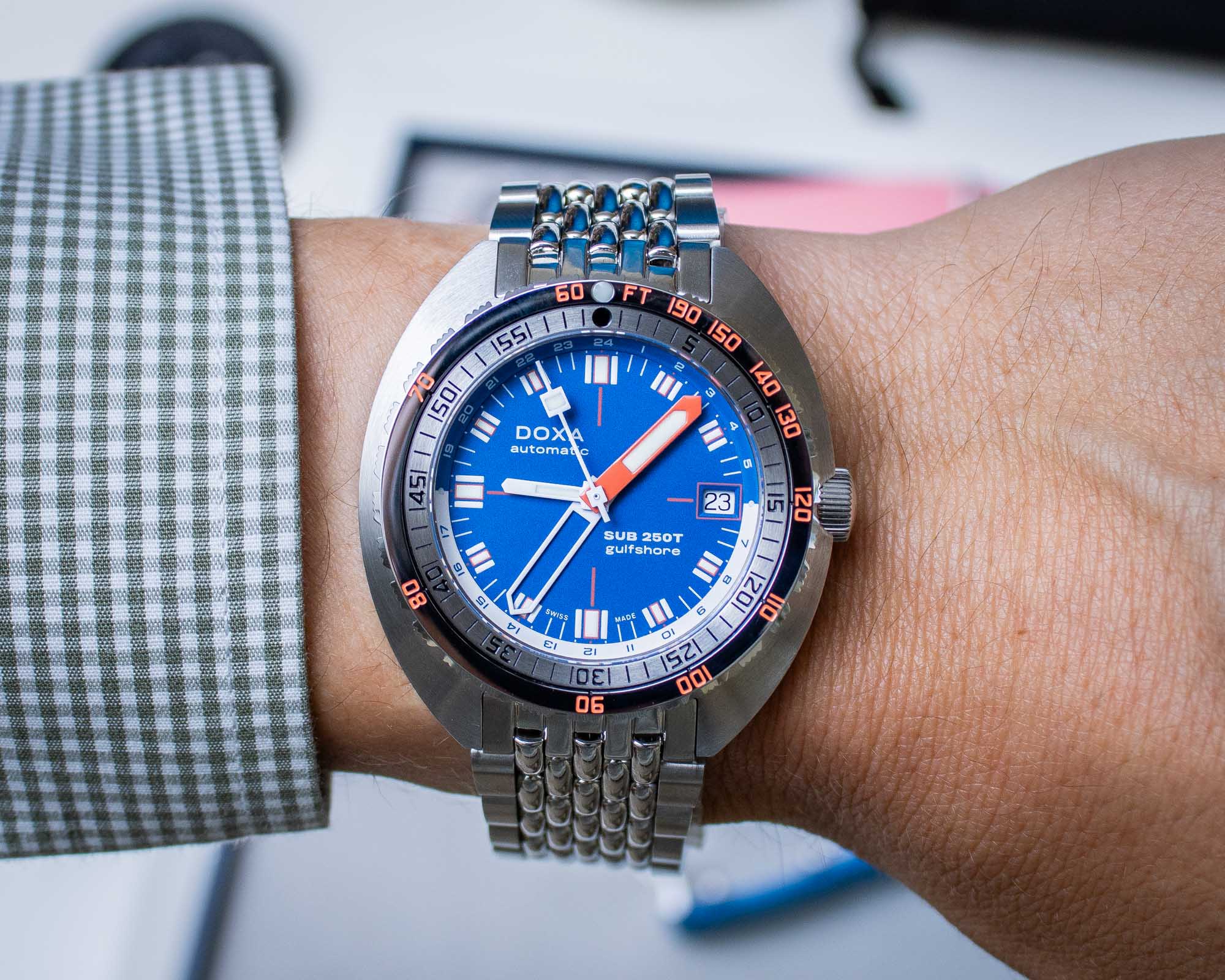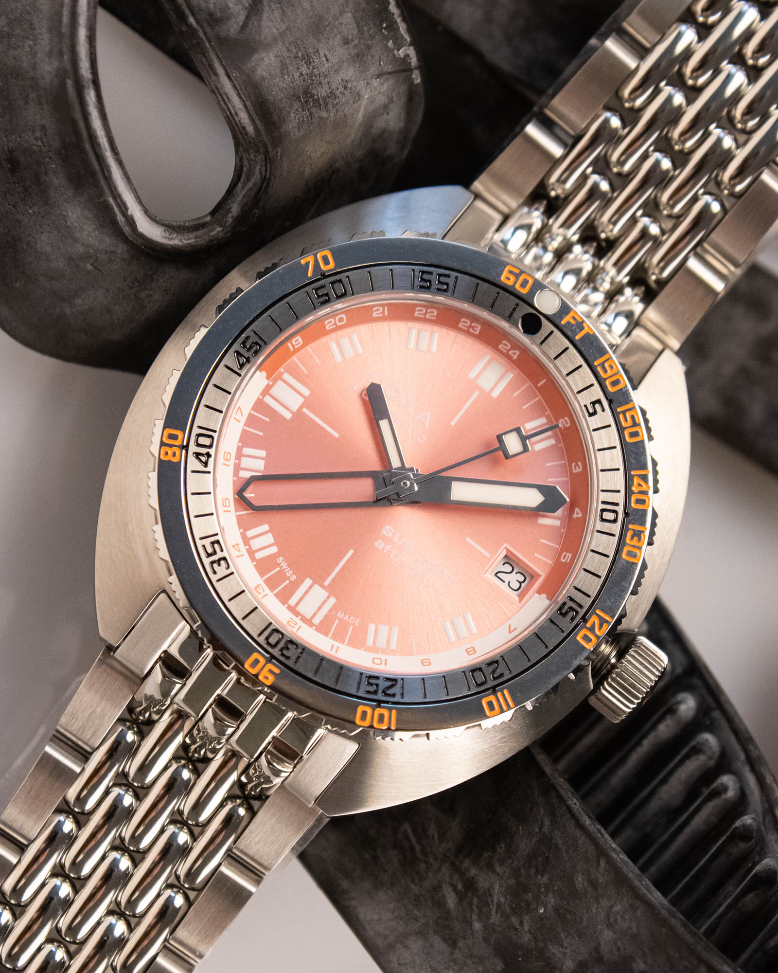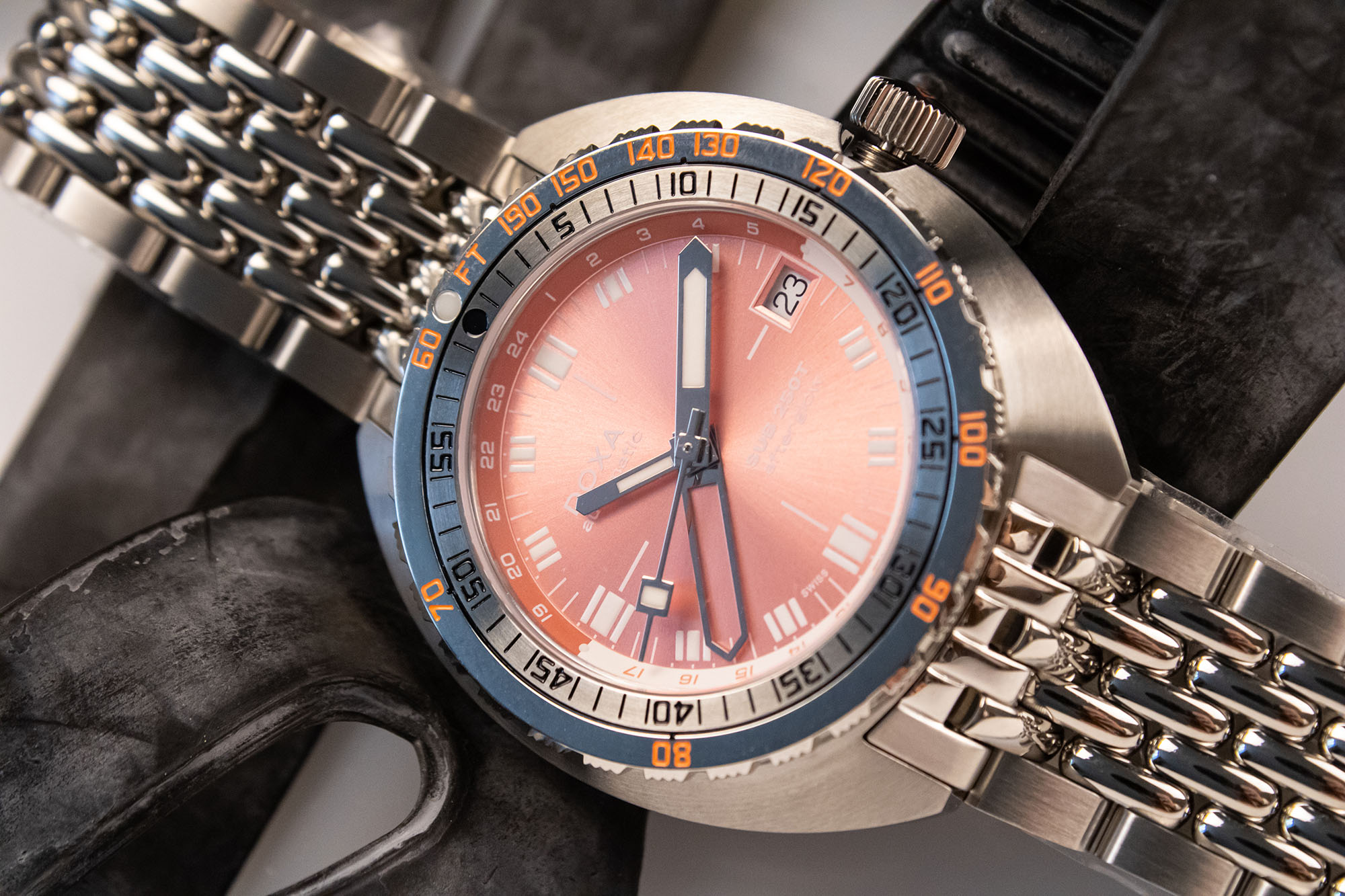 Pink seldom makes an appearance within Doxa’s catalog, with the only other instance being the “Ocean Dream” pink mother-of-pearl dial that is exclusively fitted to its SUB 200T Diamonds collection. However, blue is one of Doxa’s traditional colors, and it can be found throughout the vast majority of the brand’s modern lineup. That said, the limited-edition Exquisite Timepieces “Gulfshore” model offers a distinct appearance compared to the standard “Caribbean” blue version of the Doxa SUB 250T GMT. Along with appearing in a shade of blue that is noticeably lighter than the navy blue hue of its “Caribbean” sibling, the “Gulfshore” variant also features its 24-hour chapter ring rendered in blue and white with Coraline-colored accents, while the “Caribbean” version has a blue and orange split-color chapter ring that matches its bright orange minute hand and bezel markings.
