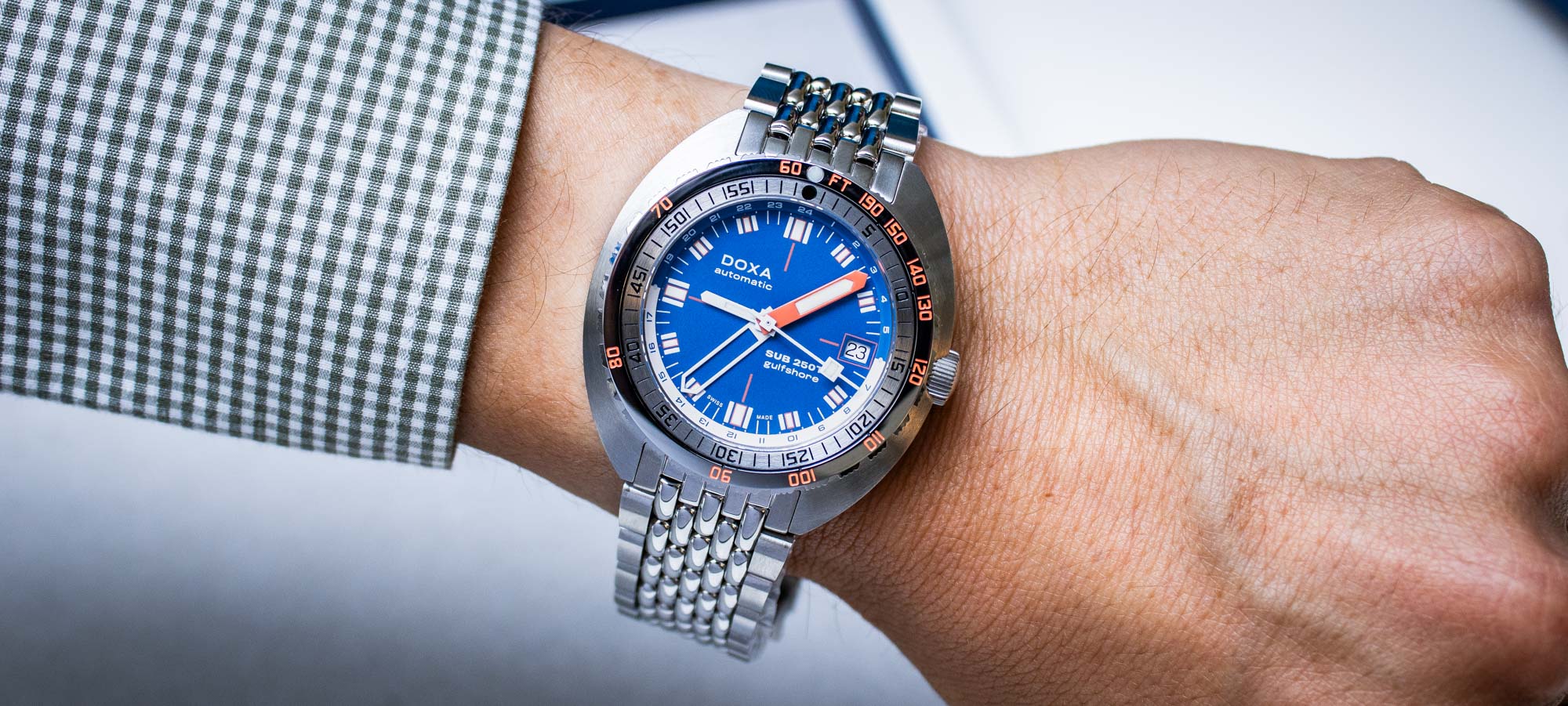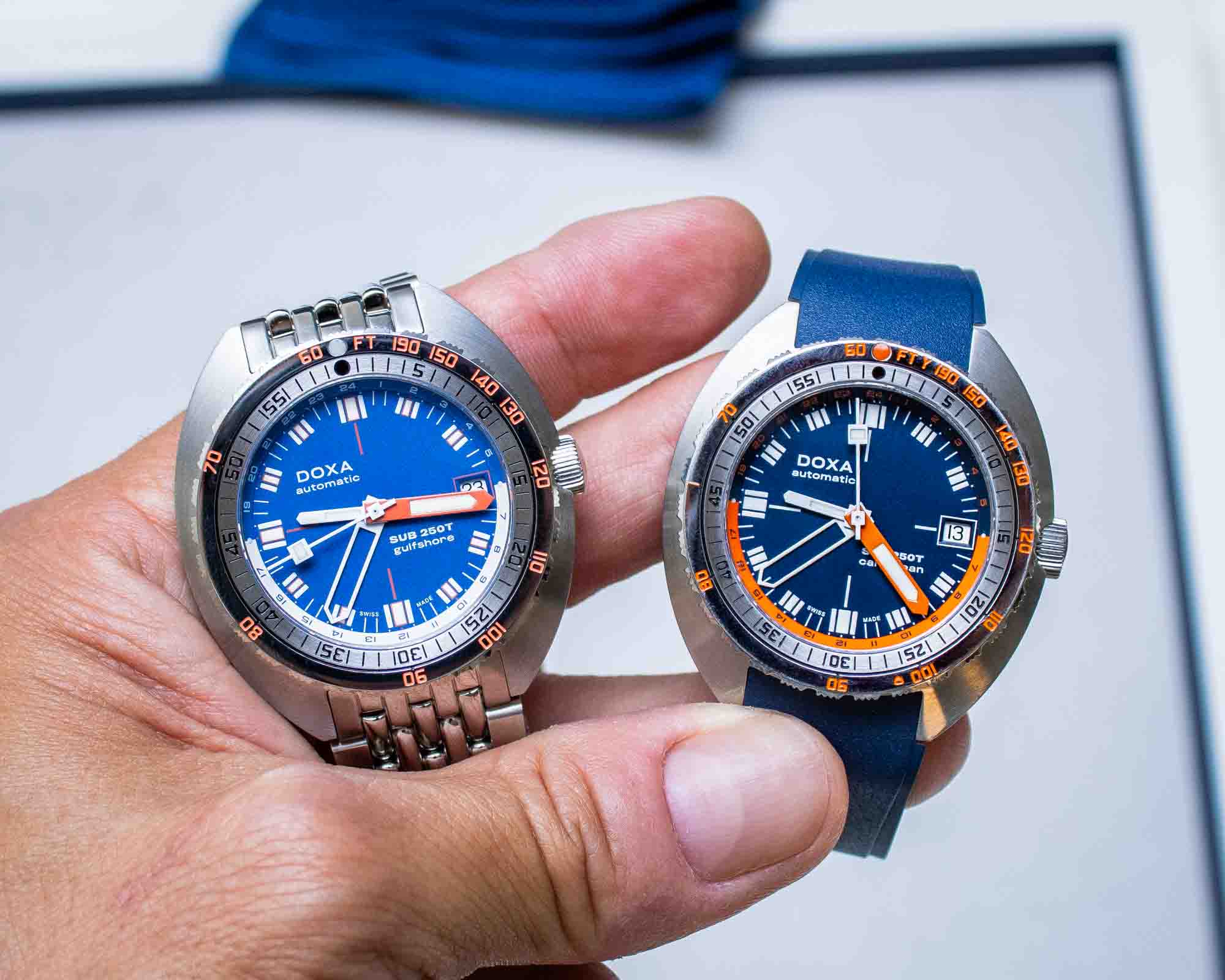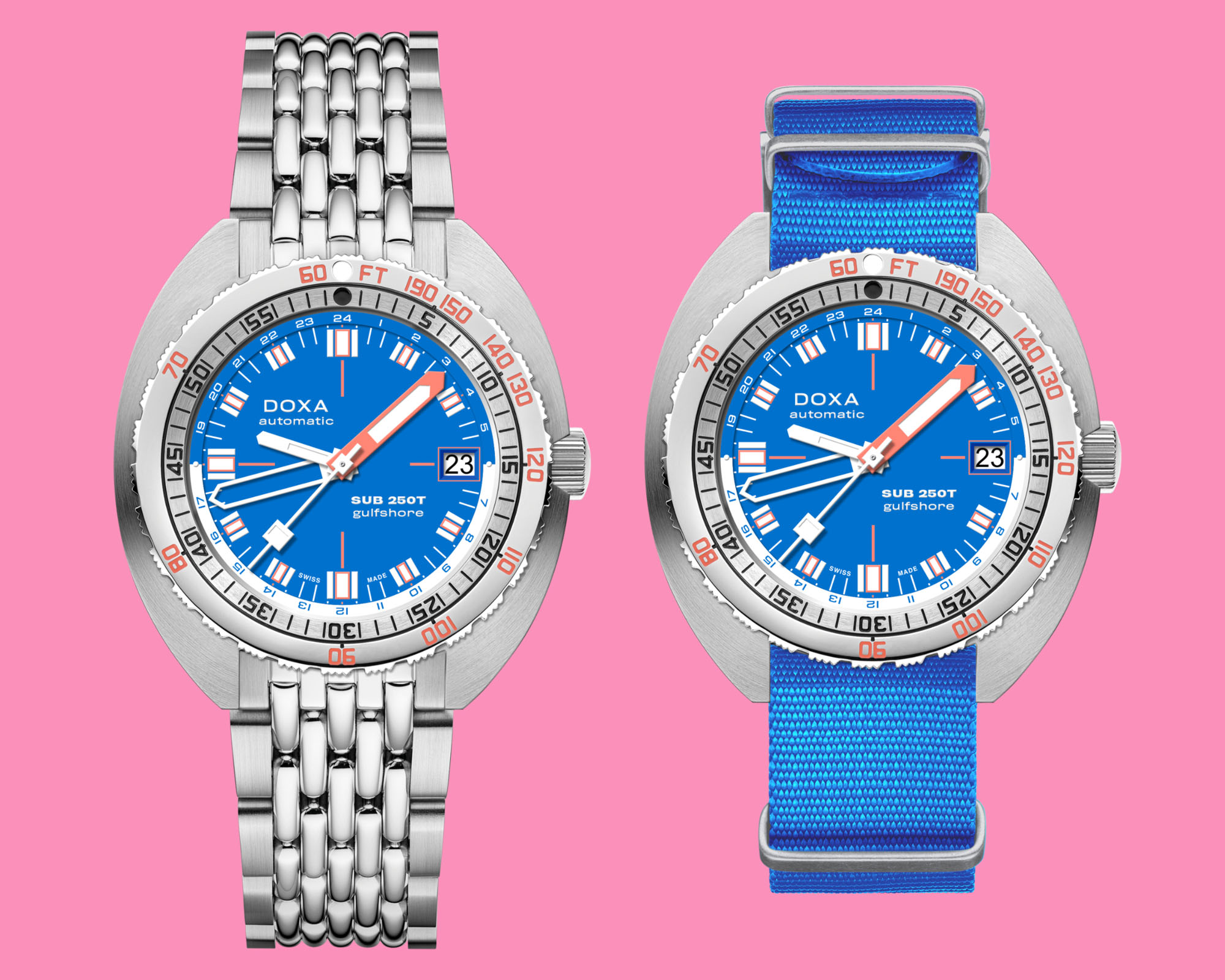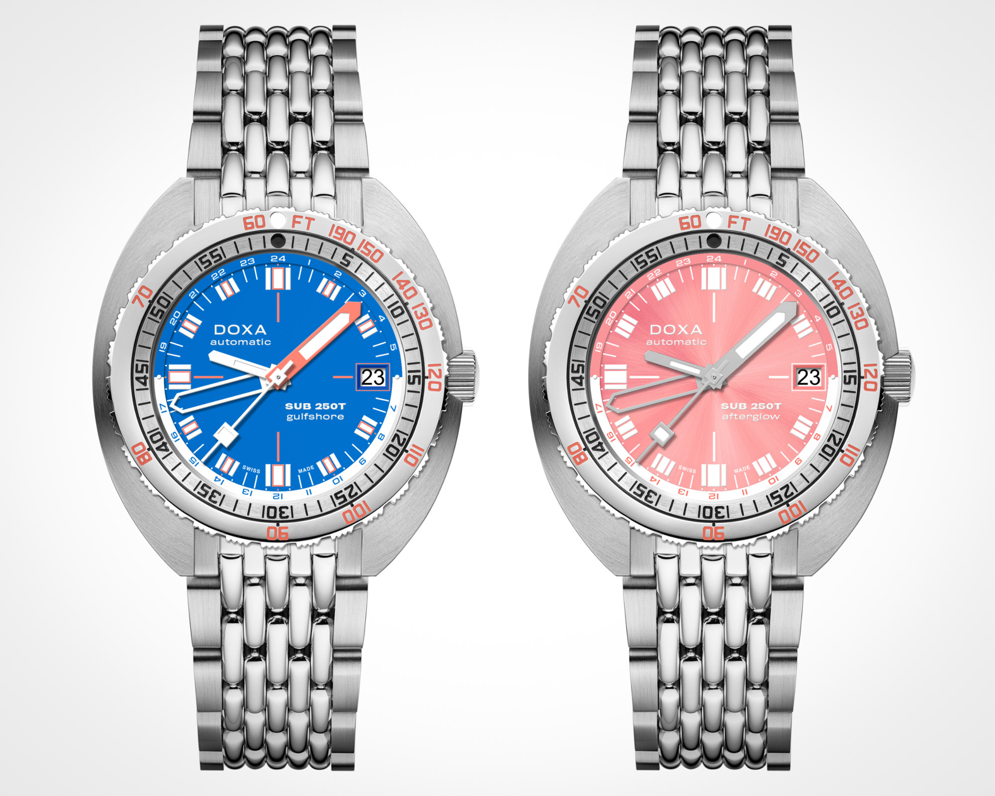 When Doxa launched the SUB 250T GMT earlier this year in 2025, the Swiss brand debuted the collection in a full range of nine different dial colors, including a new vintage-themed gradient option that previously did not exist within its catalog. However, just one month after the initial announcement of the SUB 250T GMT, Doxa has teamed up with the Naples-based retailer Exquisite Timepieces to create two new limited-edition colorways for its latest GMT-equipped dive watch. Inspired by the colors of Florida’s Gulf Coast, the Doxa SUB 250T GMT Exquisite “Gulfshore” and “Afterglow” models are fitted with bright blue and pink dials, and each colorway will be produced as a limited edition of just 50 examples.