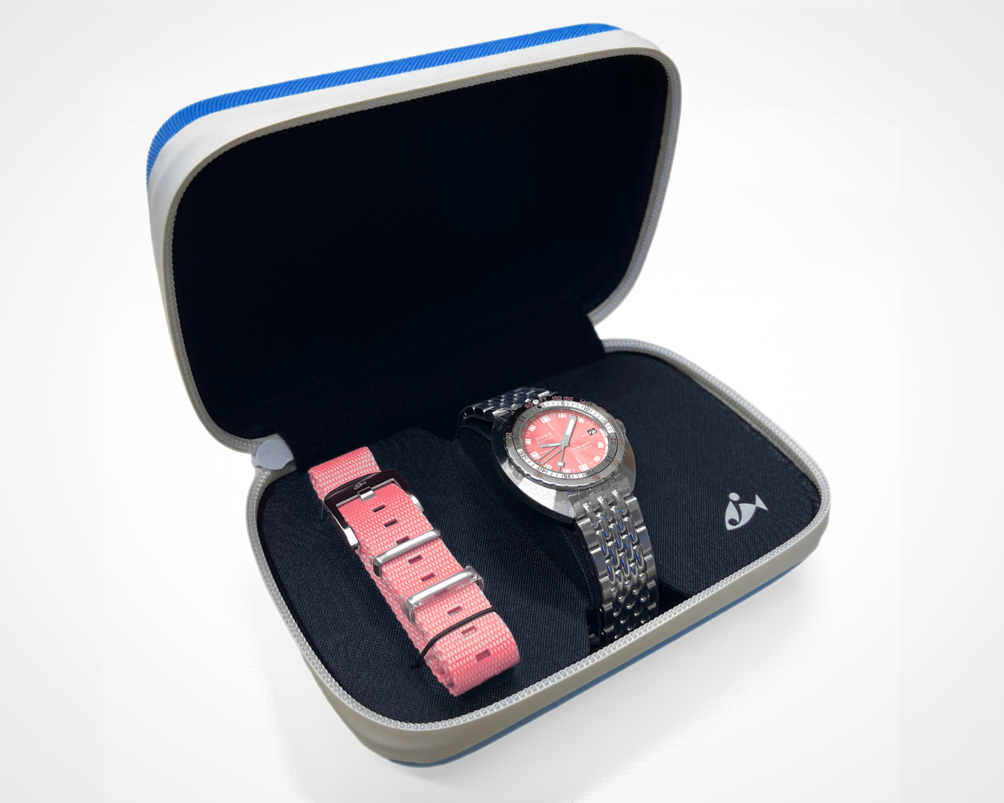 Both “Gulfshore” and “Afterglow” versions of the Doxa SUB 250T GMT Exquisite are paired with the brand’s usual stainless steel beads-of-rice bracelet, which is identical to what can be found throughout the standard SUB 250T GMT collection. Crafted from solid machined components with single-sided screws securing its removable links, the bracelet is completed by Doxa’s usual style of folding clasp, which includes an integrated extension system that is accessed by pressing the two additional buttons located on the sides of the clasp’s outer structure. However, both of the Exquisite Timepieces models also include a complementary nylon NATO strap in either blue or pink to match the hue of each watch’s dial, and the duo of limited-edition models are delivered in a blue and gray travel case that houses both the watch and its extra strap.