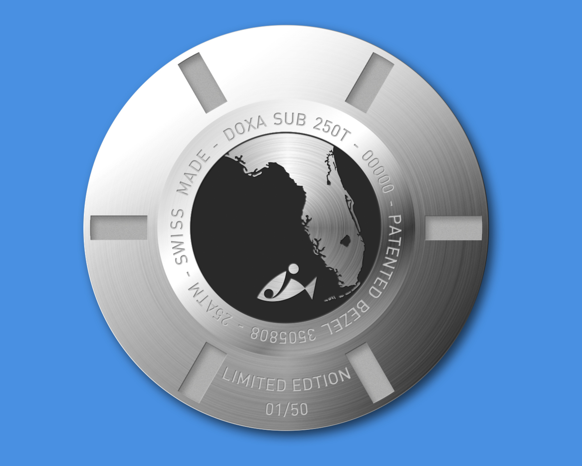 With that in mind, although the unidirectional bezels fitted to the new “Gulfshore” and “Afterglow” colorways appear in the exact same style as the rest of the SUB 250T GMT series, their markings are finished in a historic Doxa color called “Coraline,” which has a pale red/orange appearance and dates back to the 26mm woman’s SUB 200 dive watch from the early 1970s. Additionally, the same shade of “Coraline” is used to finish Doxa’s fish emblem that appears on the winding crown, and rather than having the same caseback as the standard SUB 250T GMT models, the Exquisite Timepieces “Gulfshore” and “Afterglow” models feature caseback engravings that depict the Florida state outline with Doxa’s fish logo swimming offshore above the Dry Tortugas, which is a chain of islands near Key West that serves as a favorite fishing destination for the owners of Exquisite Timepieces.
