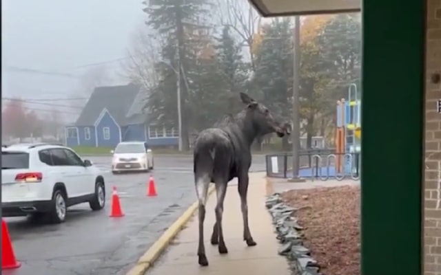 As the moose moved along, it paused by the school building and looked through the windows — almost like it was curious about what the kids were learning inside or wanted to say hello. It was a moment that felt surreal, like a scene from a children’s storybook coming to life.