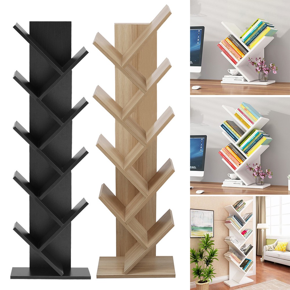 Tree Shape Free Standing Bookshelf Wood 3/5/9 Shelves Desk Bookcase Display Rack