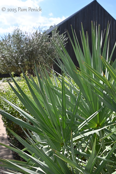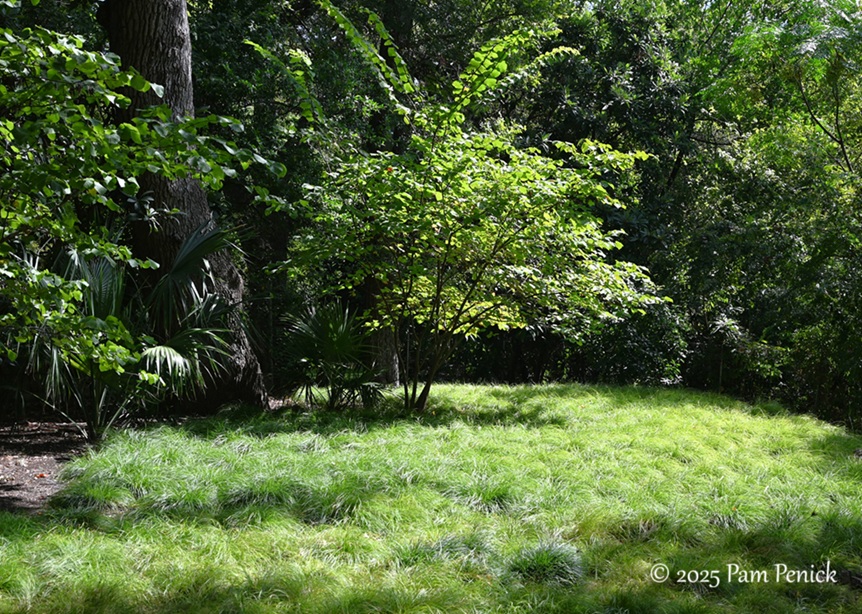 Along a shady side of the garden, dwarf palmetto and foxtail fern fill the understory. The orange tree in the background may have been in fall color or may have been a victim of summer drought. We’ll call it fall — it was pretty!