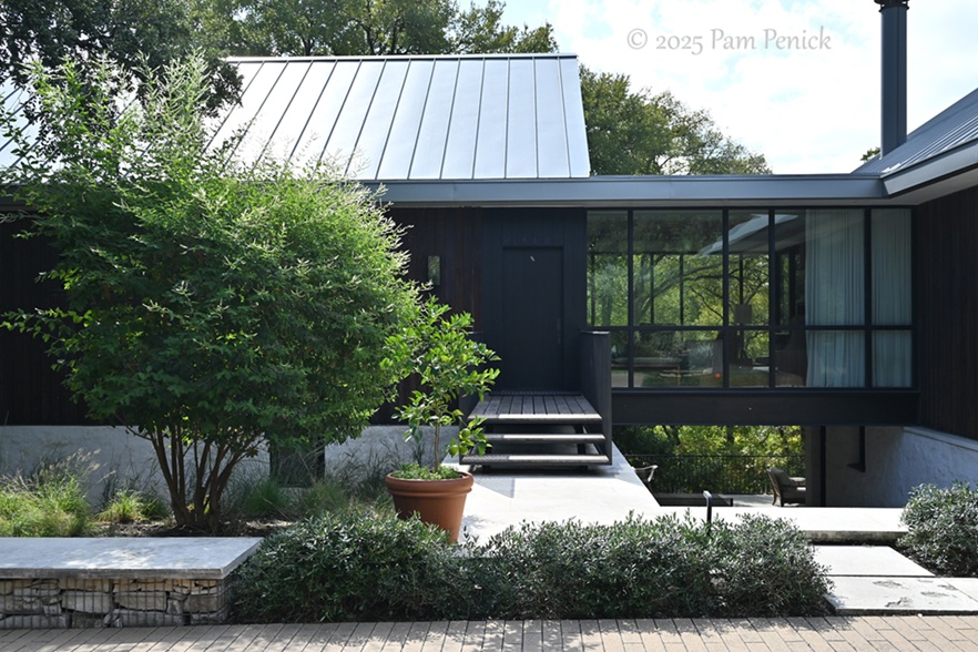 The Belmont Parkway garden was designed by Studio Balcones, headed by landscape architect Jennifer Orr (whose work is featured in Gardens of Texas!). In front, a path-like driveway leads through screening clumps of silver saw palmetto underplanted with lamb’s ears — a cool, silvery green combo.