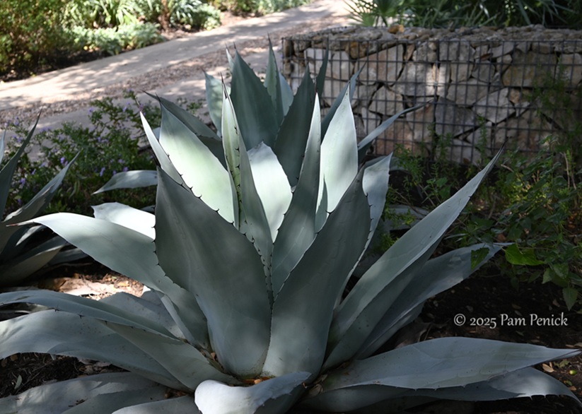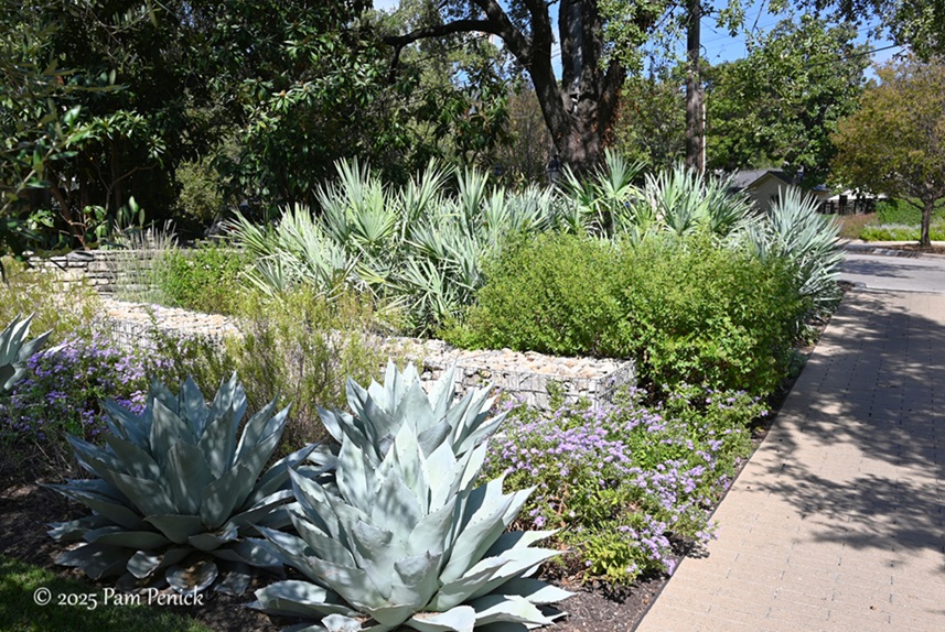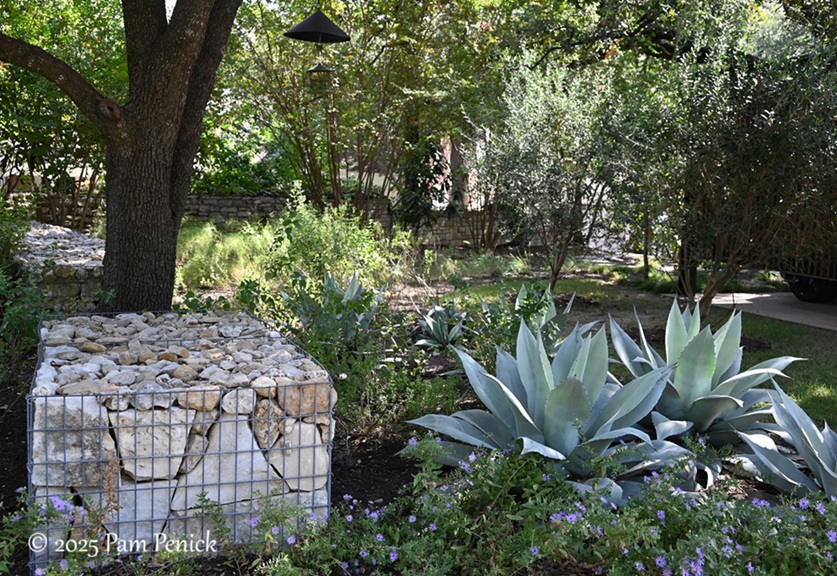 On the other side of the driveway, the gabion wall continues, with a break to accommodate a tree. Silver-blue whale’s tongue agaves cluster in front like chunky starfish.