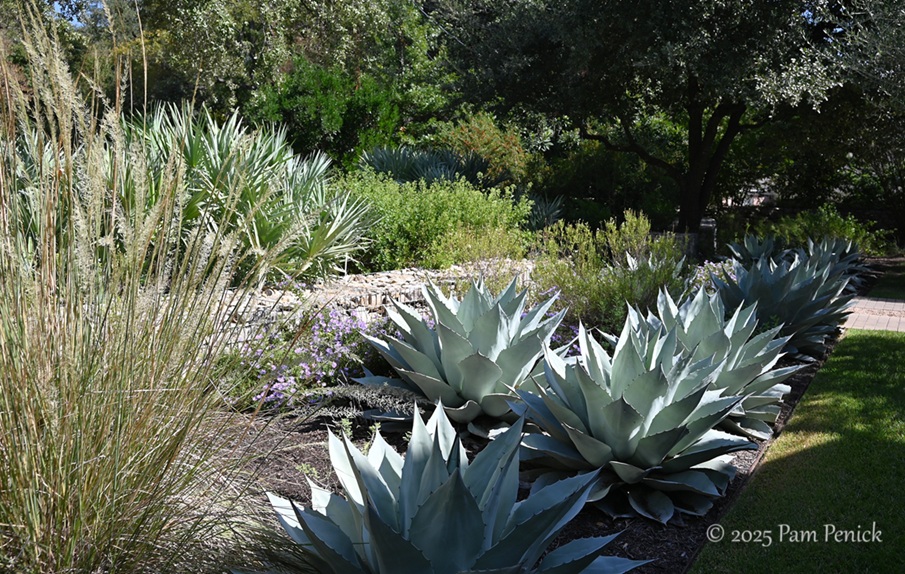 Whale’s tongue agaves with a tall, flowering grass — Lindheimer muhly, I think