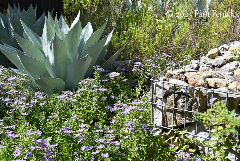 Whale’s tongue agave, fall aster, and gabion wall detail