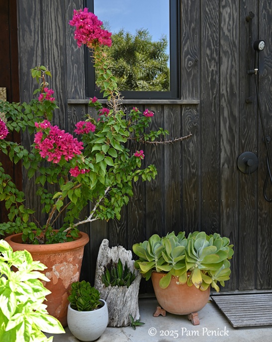 A pretty vignette of potted succulents and hot-pink bougainvillea