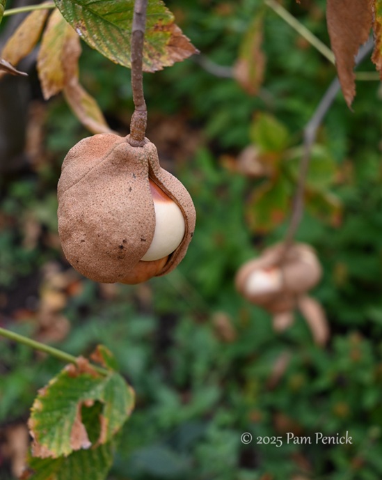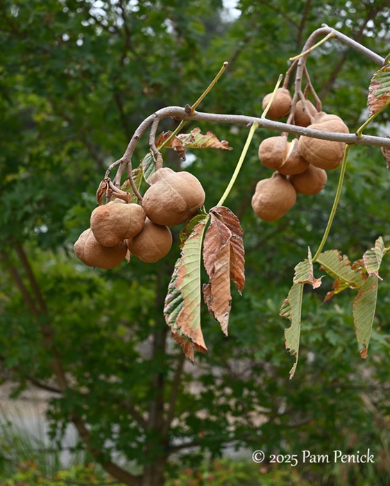A scarlet buckeye tree, another Texas native, was dangling dozens of its distinctive brown seedpods.