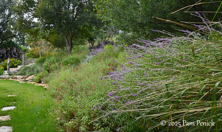 Mexican bush sage and other salvias cascade down-slope, making a pretty view for the lawn and front porch.