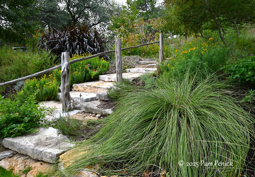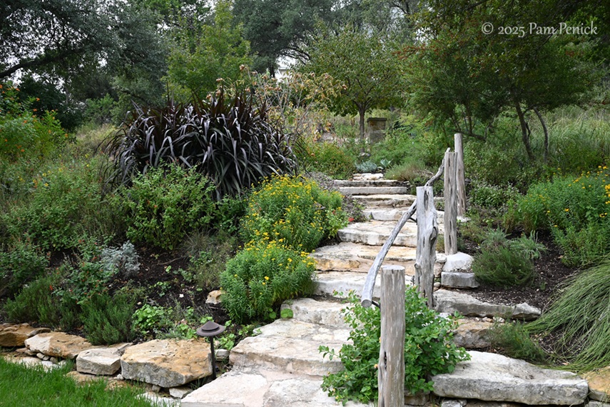Limestone steps with a cedar railing — more Hill Country flavor — lead through the perennial garden down to house level.