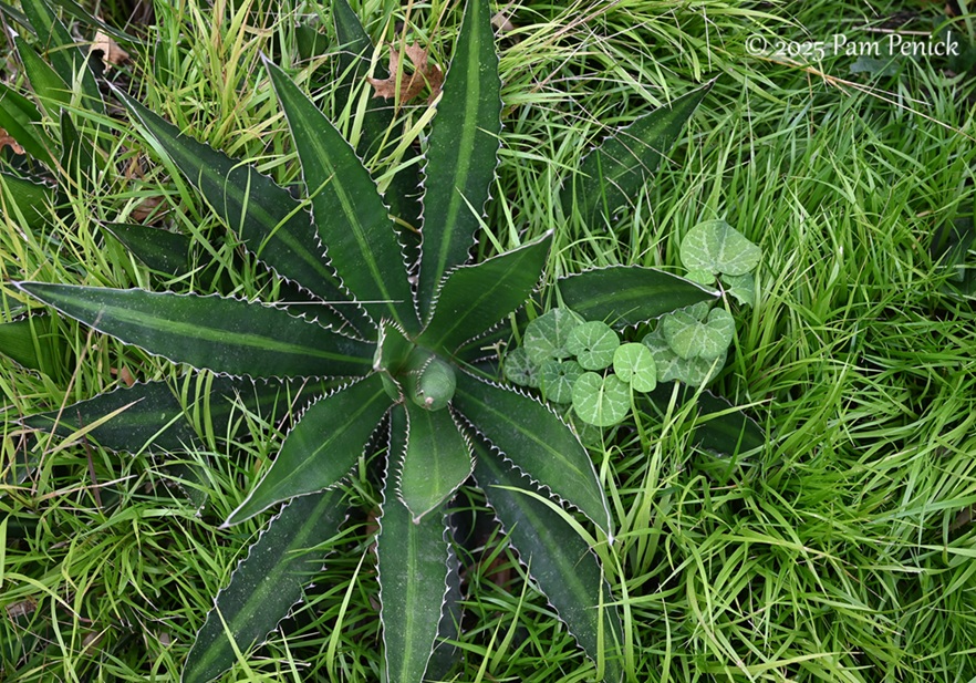 Agave lophantha in the twoflower melicgrass, with a little corsage of hardy Dutchman’s pipevine